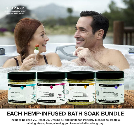 Hot Tub Aromatherapy Full Body Hemp Soak Collection Sampler Pack - 4Oz 1000 Mg Hemp Spa Aromatherapy Hot Tub Bath Salt Crystals 4 Pack: Release 22, Reset 06, Unwind 17, Ignite 09
